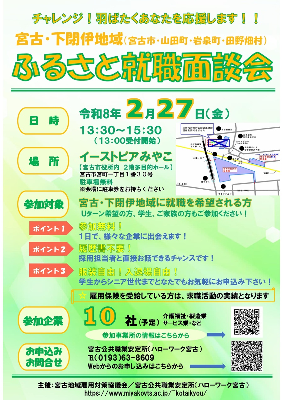 あなたの挑戦、応援します! 宮古市や下閉伊地域(山田町・岩泉町・田野畑村)に就職を希望する方を対象とした企業面談会です。管内の企業約10社が企業ブースを開設し、ご希望の企業ブースで担当者と直接お話しいただけます。学生の方…