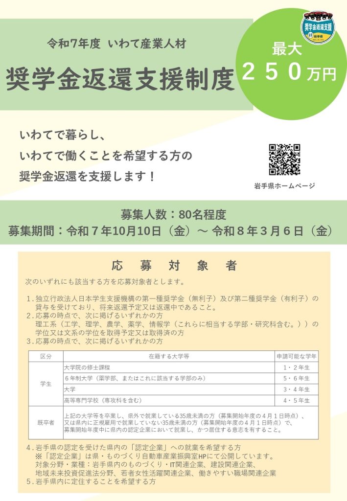 令和7年度いわて産業人材奨学金返還支援制度【2次募集期間 R8.3.6まで】