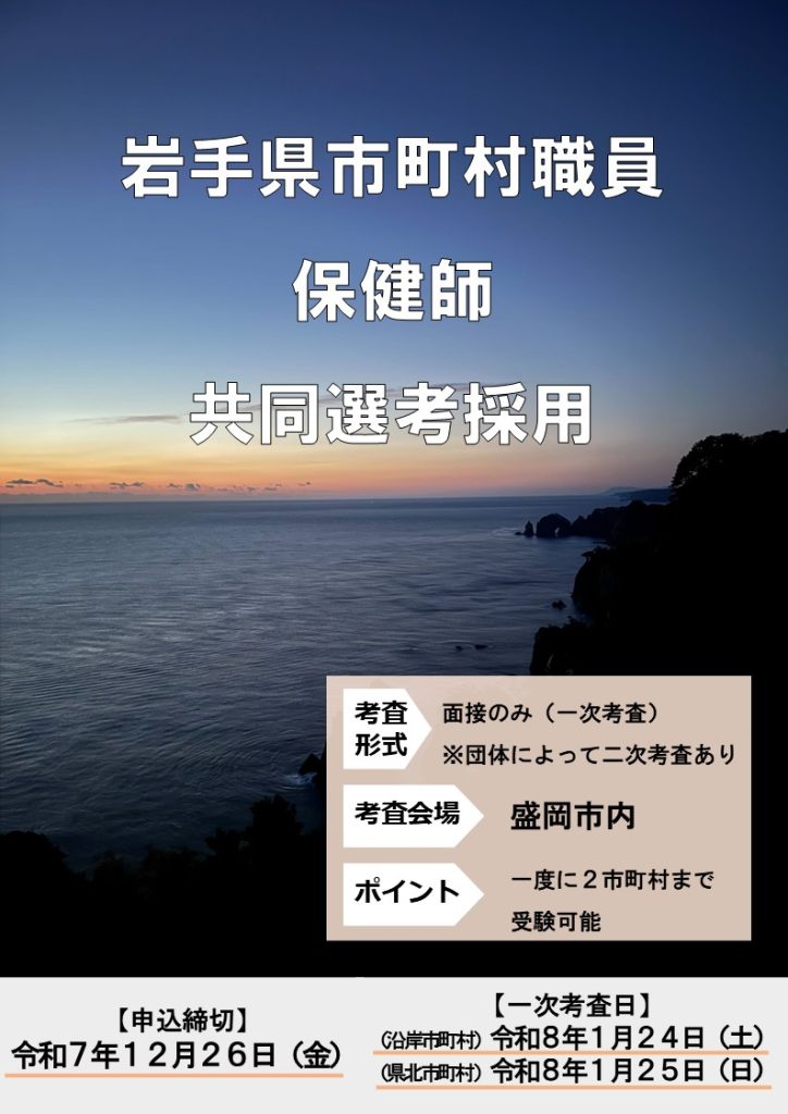 本採用は、岩手県内の沿岸エリアの市町村が保健師を採用するために合同で行うものです。