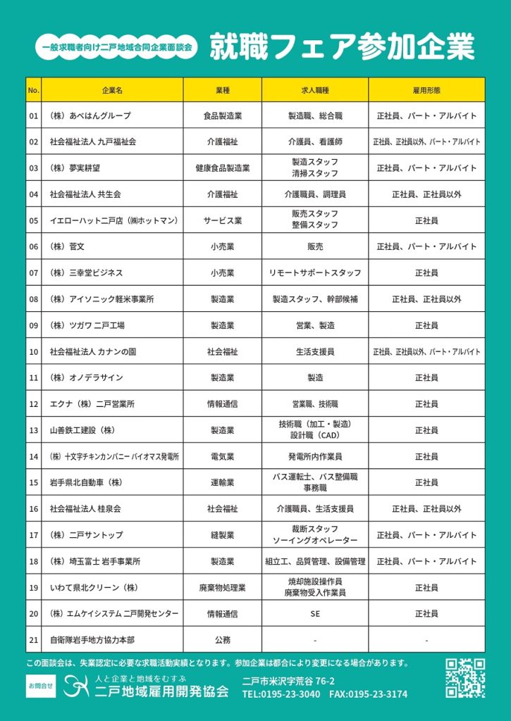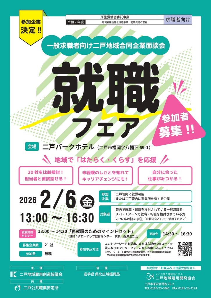 【2/6(金)@二戸市】二戸地域の21社が出展「一般求職者向け二戸地域合同企業面談会 就職フェア」