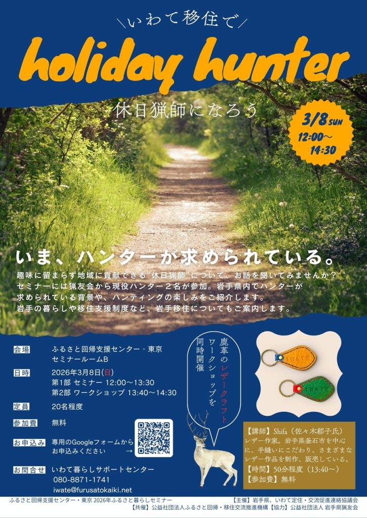 【3/8(日)@東京】レザークラフトワークショップも開催「いわて移住で休日猟師になろう“holiday hunter”」