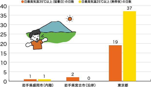 東京圏に比べて、岩手の夏は極端に暑い日が2日程度しかありません。