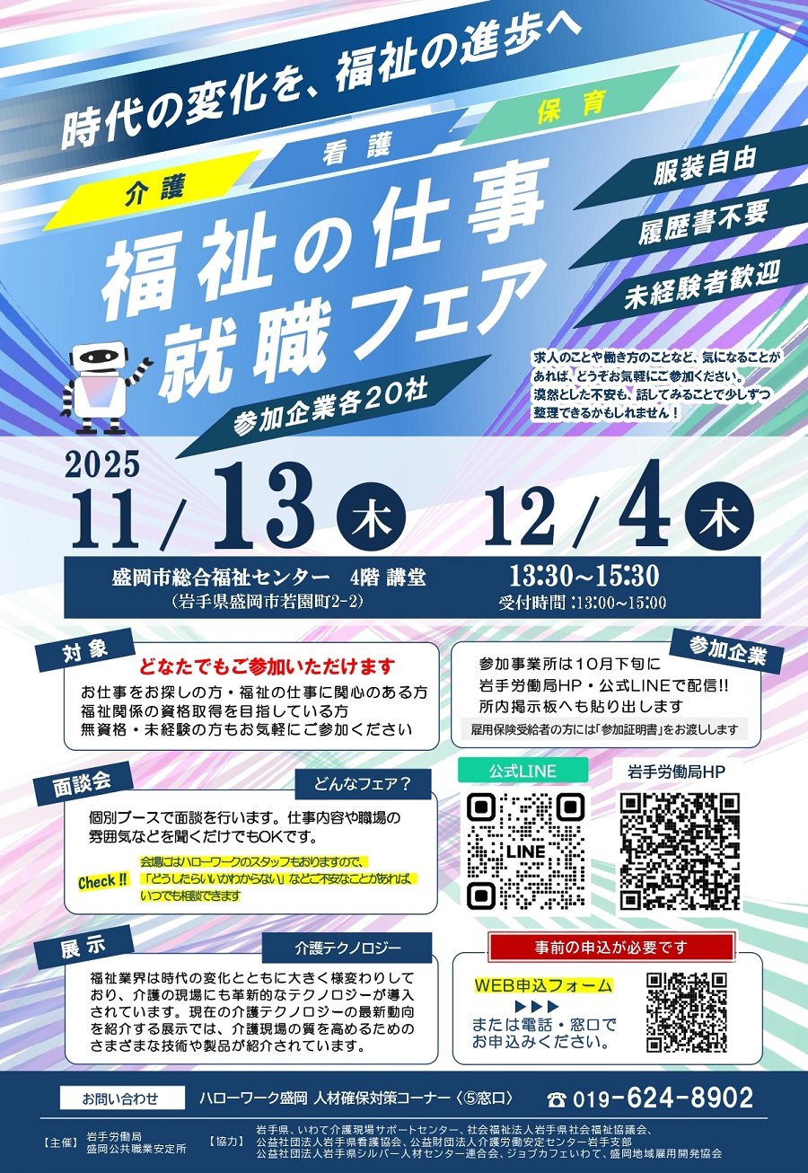 【11/13(木),12/4(木)@盛岡市】各回20社が参加予定「介護就職デイ2025福祉の仕事就職フェア」 NEW