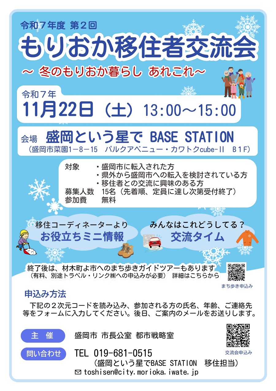 冬の暮らし、寒さや雪の対策について情報交換 県外から盛岡市へ移住された方や移住希望の方同士で、暮らしの情報交換や交流を行います。冬に知っておきたい盛岡初心者向けの情報を移住コーディネーターからご案内したり、暮らしの情報交…