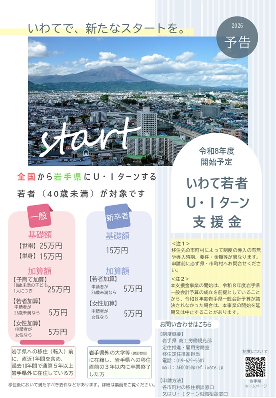 令和8年4月からは④・⑤の「いわて若者U・Iターン支援金」を開始予定です。